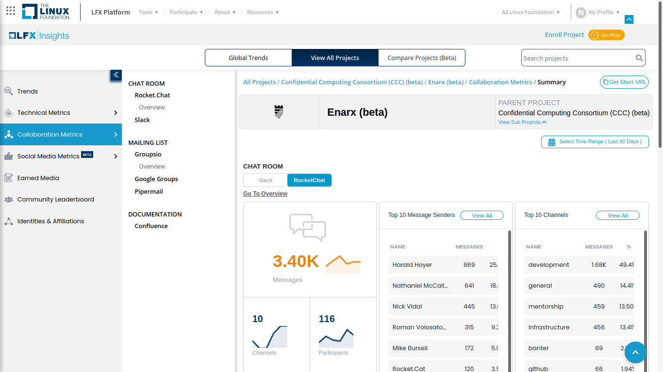 LFX Insights also provides a powerful integration with several discussion tools, including Slack, Rocket.Chat, and mailing lists. It's possible to see how many participants there are, how many messages have been exchanged, who are the top senders, and what are the most popular chat channels over time.