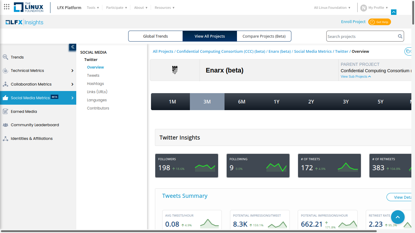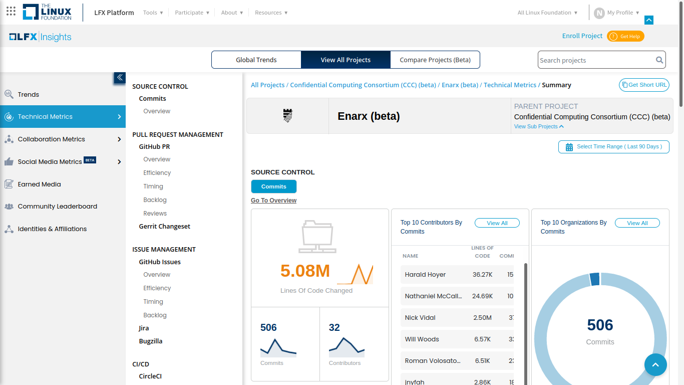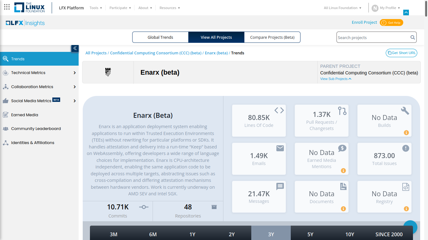 Several tools are available to gather and analyze these metrics. One of these tools is LFX Insights, which is available to all Linux Foundation projects, of which Enarx is part. LFX Insights provides several sections, including 1) Trends, 2) Technical metrics, 3) Collaboration metrics, and 4) Social media metrics.